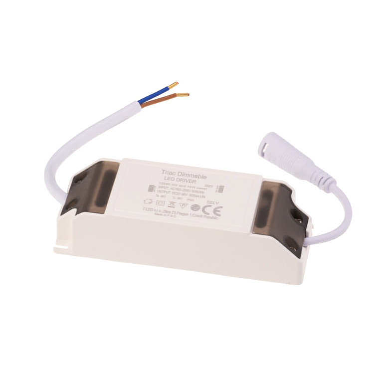 Stmívatelný zdroj pro LED panely T-LED 9W a 12W. Vstup: 180-265VAC 50/60Hz, výstup: 27-36VDC, 300mA 12W, rozměry: d 103 x š 36 x v 25mm