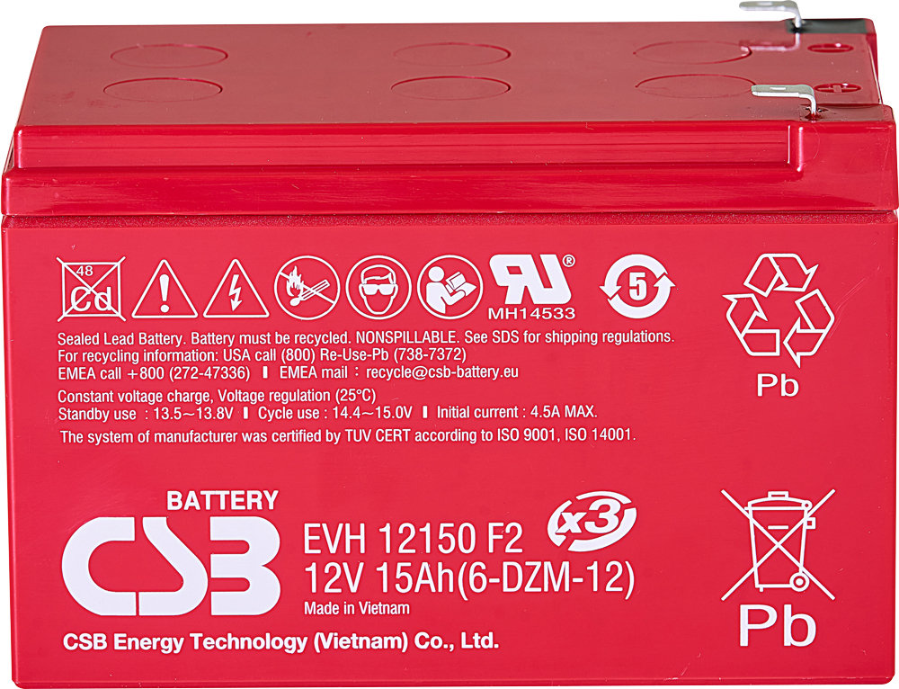 Cyklický akumulátor 12V/15Ah CSB EVH12150F2. Životnost až 400 cyklů vybití nebo 5 let ve Standy režimu. Napětí:12V. Kapacity 20hod.: 15Ah, Maximální vyb, proud 5sec.: 180A. Typ pólu: Faston 6,3mm. Rozměry? 151 x 98 x 98mm, Váha 4,6kg.