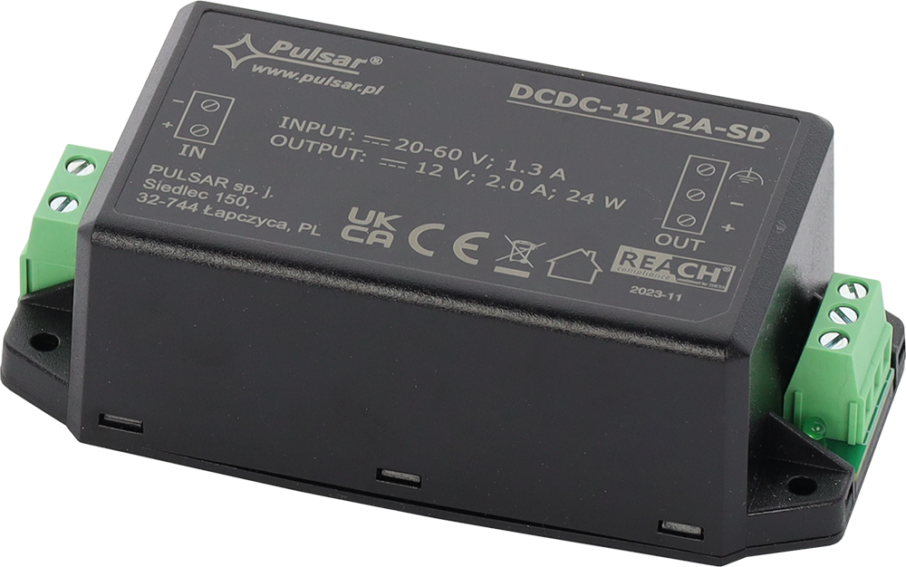 Snižovací DCDC měnič 20-60VDC na 12VDC/2A. Povrchová montáž, rozměry: 10 x 35 x 53 (+/-2 mm). Signalizační LED, ochrana SCP, OLP.