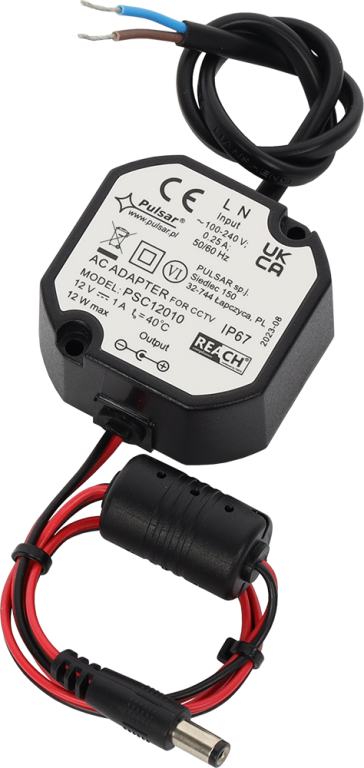 Napájecí zdroj v pouzdru IP67 12V / 1A. Vstupní napětí je 90÷264VAC/50Hz. Rozměry jsou 50 x 48 x 25 mm.