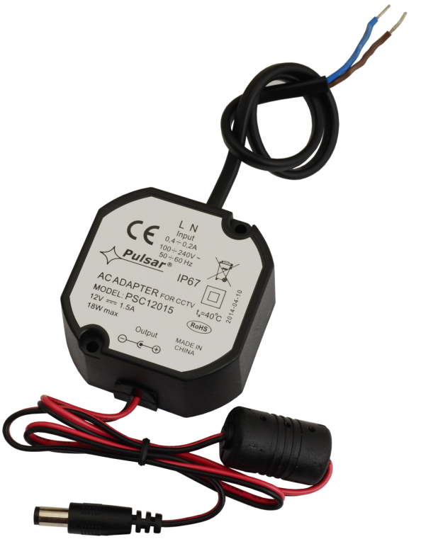 Napájecí zdroj v pouzdru IP67 12V / 1,5 A. Vstupní napětí je 90÷264VAC/50Hz. Rozměry jsou 58 x 58 x 28 mm.