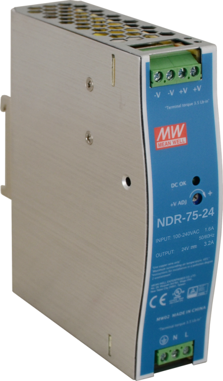 Napájecí zdroje NDR-75-24 na liště DIN disponují vstupním napětím 90÷264VAC / 127÷370VDC a výstupním napětím 3,2A/24VDC. Rozsah regulace napětí je 24V÷28V. Účinnost zdroje je 88%. Ochranu poskytuje OLP, OHP, OVP, SCP*. Rozměry zdroje jsou 32 x 125 x 102 mm.