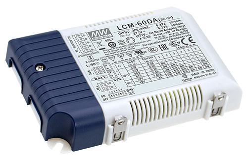 Stmívatelný proudový zdroj Meanwell LCM-60DA, 6-kanálů, 60W, DALI, IP20. Výstupní parametry proudu se nastavují pomocí DIP přepínače (500mA, 600mA, 700mA, 900mA, 1050mA, 1400mA). Stmívání se provádí pomocí vratného vypínače.