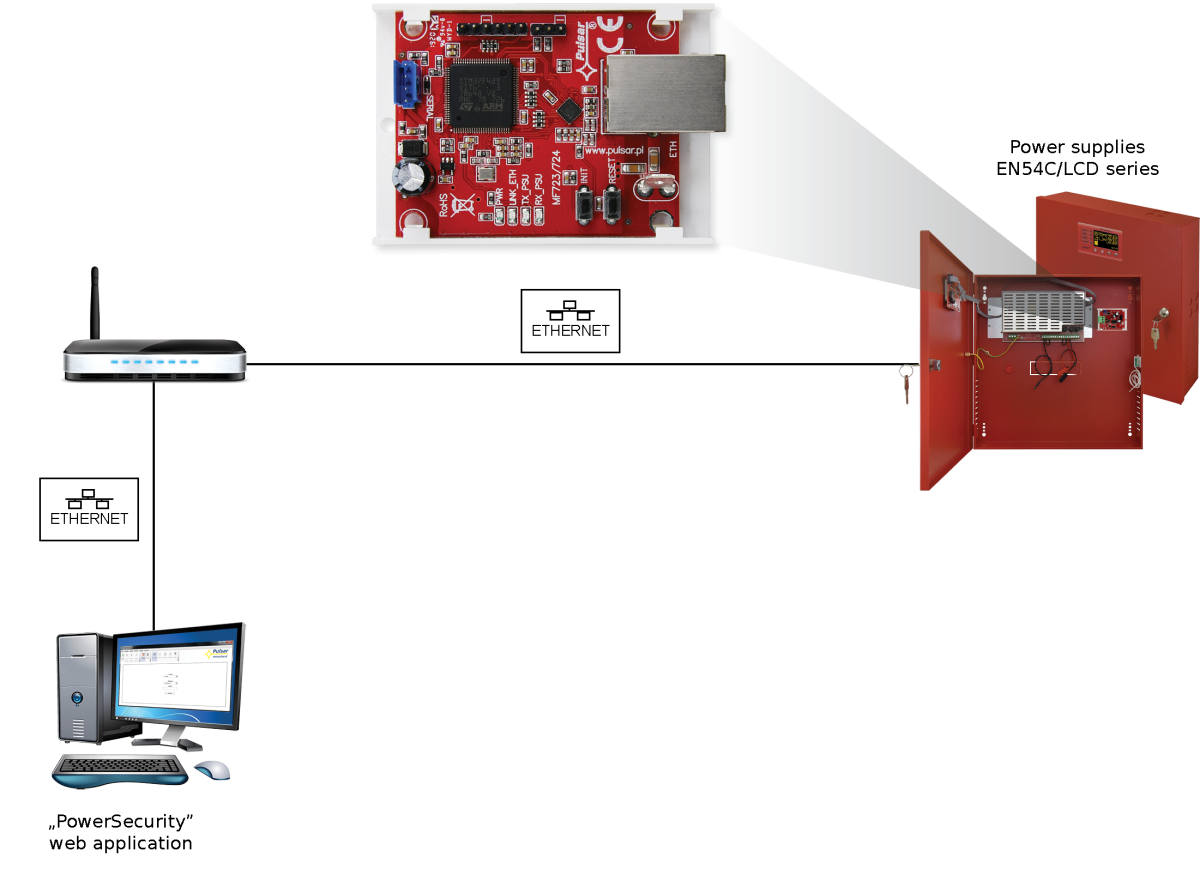 Rozhraní Ethernet INTE-C je určeno pro spolupráci s napájecími zdroji řady EN54C-LCD a HPSG3-LCD. Software PowerSecurity umožňuje vzdálené sledování parametrů prostřednictvím cyklického náhledu na aktuální stav napájecího zdroje, čtení protokolu událostí a diagramů proudů a napětí a provádění vzdáleného testu baterie.