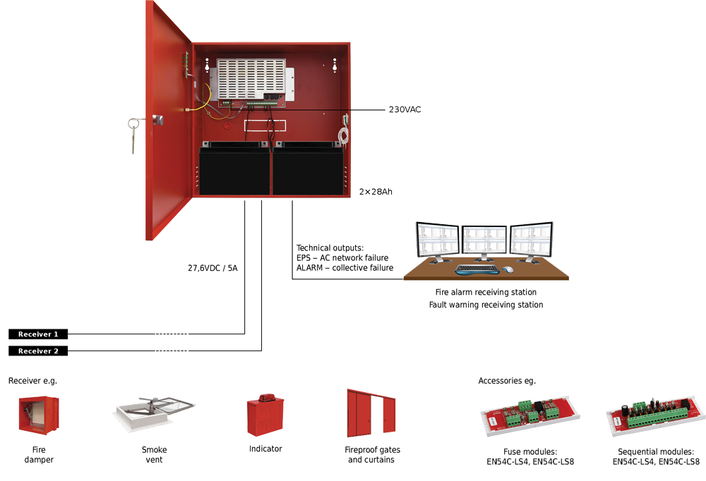 EN54C 27,6V/5A/2x28Ah napájecí zdroj pro protipožární systémy