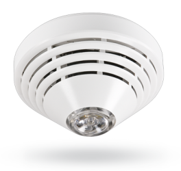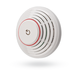 Sběrnicový kombinovaný detektor kouře a teploty se sirénou (může signalizovat libovolný poplach systému) a záložními bateriemi (3x1,5V AA) pro systém Jablotron JA-100