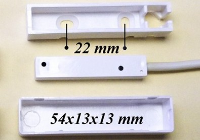 Povrchový bílý 4-vodičový magnetický kontakt s 3m přívodním kabelem pro 2 stupeň zabezpečení dle EN50131 pracovní vzdálenost 30 mm, rozměry 54 x 13 x 13 mm.