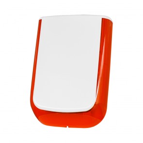 Zálohována externí siréna Irene s oranžový blikačem a bílým krytem. Blikač je dokola celé sirény a skládá se z 15-ti výkoných LED diod. Fungování sirény je programovatelné pomocí dvou tlačítek uvnitř (tón zvuku, blikání blikače, hlasitost). Výkon sirény je 125 dB. Akumulátor 2,3Ah.