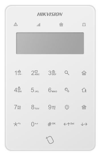 AX HYBRID PRO drátová klávesnice DS-PK501LTM-HWE s LCD displejem a čtečkou čipů. 868 MHz. 2 integrované vstupy a 1 integrovaný reléový výstup. Lze připojit dohromady až 64 čipů či nouzových tlačítek. Nabízí LED indikace stavu. Proudový odběr 200mA. Rozměry: 175 × 110 × 27 mm, hmotnost 301 g. Provozní teplota: -10°C až +40°C.