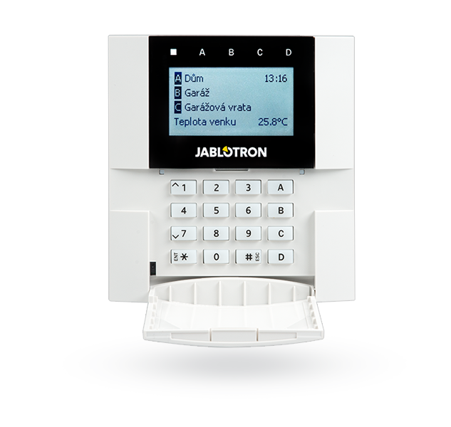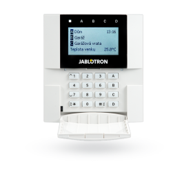JA-110E je sběrnicová klávesnice s LCD displejem, RFID čtečkou a 1 drátovým vstupem pro ovládání zabezpečovacího sytému JA100+. obsahuje 4 funkční klávesy a v systému zabírá 1 pozici.