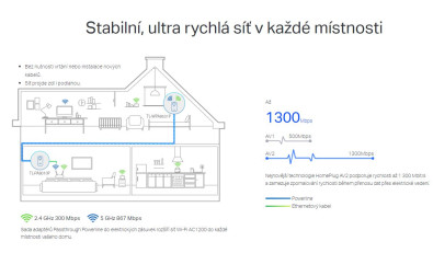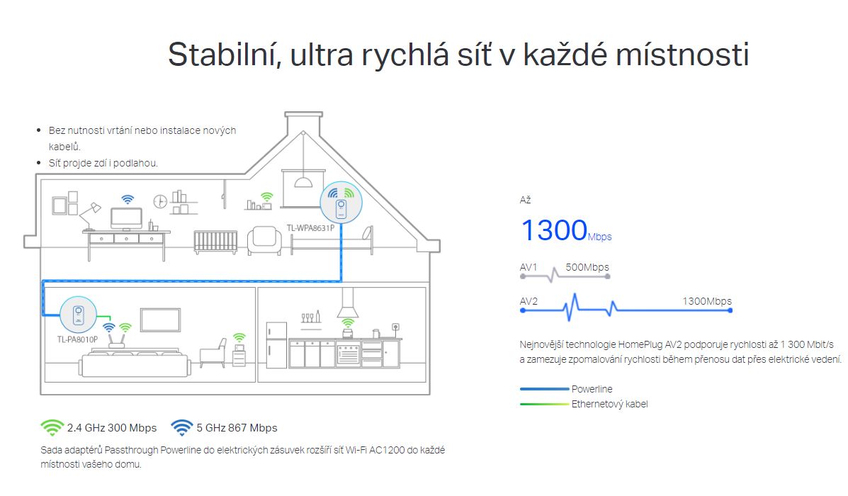 Sada dvou AV1300 powerline Wi-Fi adaptérů TP-link TL-WPA8631P se třemi LAN porty a TL-PA8010P s jedním LAN portem o rychlosti přenosu dat elektrickým vedením až 1300 Mb/s. Při připojení zařízení k routeru rozšíří Wi-Fi síť s rychlostí až 867 Mb/s v pásmu 5 GHz a až 300 Mb/s v pásmu 2,4 GHz. Provedení plug and play a snadné šifrování stisknutím tlačítka párování/reset. Integrovaná napájecí zásuvka zajišťuje využití každé elektrické zásuvky.