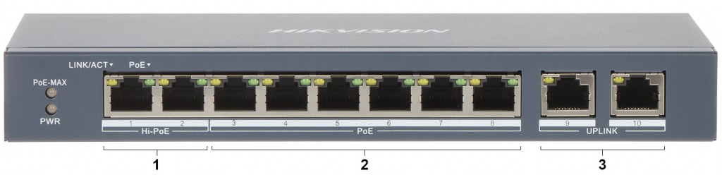 10 portový řízený PoE switch Hikvision DS-3E1310HP-EI(B) s možností napájet až 8 IP zařízení současně do maximálního výkonu 110W s výkonem na porty 1-2 jednotlivě max. 90W a porty 3-8 jednotlivě max. 30W, v případě zapojení všech portů 13,75W. IP zařízení lze napájet do 300 metrů od switche, i při přepnutí do Extend modu, avšak při rychlosti 10Mbps pro kabeláž UTP Cat5E, Cat6E. Dále tento model disponuje ochranou proti přepětí do 6kV pro PoE porty. Hardwarová revize. Síťové připojení je zajištěno pomocí portu RJ45 (1Gbps) pro metalické rozvody. Napájení je 54V DC. Rozměry jsou 217,6 x 103,35 x 27,8mm. Provozní teplota -10°C až do +55°C.