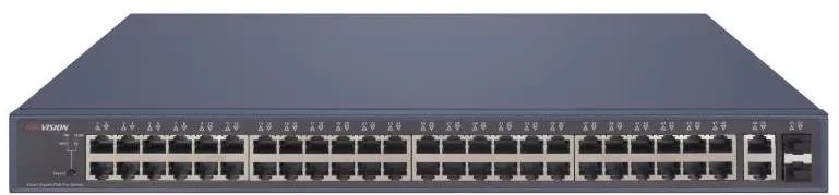52 portový řízený PoE switch Hikvision DS-3E1552P-SI s možností napájet až 48 IP zařízení současně do maximálního výkonu 470W s výkonem na jeden port maximálně 30W, v případě zapojení všech portů 9,8W. IP zařízení lze napájet až do 100m od switche, při přepnutí do Extend modu lze rozšířit pracovní vzdálenost až na 250m, avšak při rychlosti 10Mbps pro UTP Cat5e a Cat6. Síťové připojení je zajištěno pomocí portu 2x RJ45 (1Gbps) pro metalické rozvody, při využití 2x optických rozvodů s SFP moduly rovněž 1Gbps. Napájení je 230V AC. Rozměry jsou 440 x 44 x 323,8mm. Provozní teplota 0°C až do +45°C.