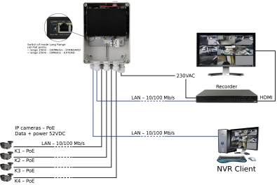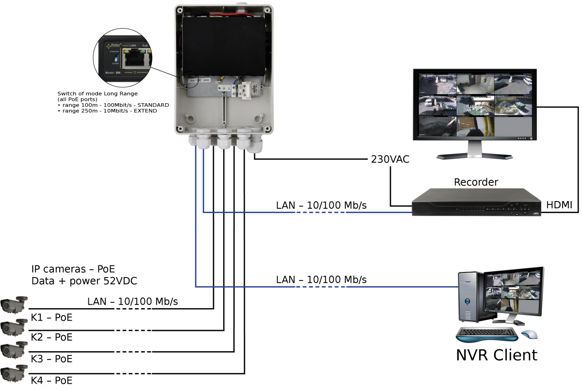 6 portový neřízený venkovní PoE switch v boxu Pulsar S64H s možností napájet až 4 IP zařízení současně do maximálního výkonu 30W s výkonem na jeden port maximálně 30W, v případě zapojení všech portů 7,5W. IP zařízení lze napájet do 100 metrů od switche, při přepnutí do Extend modu lze rozšířit pracovní vzdálenost až na 250 metrů. Rozměry jsou 148 x 198 x 78mm. Provozní teplota -25°C až do +55°C.