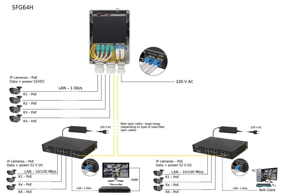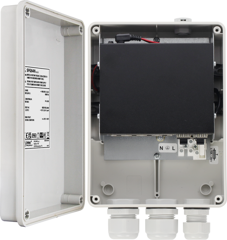 6 portový neřízený gigabitový venkovní PoE switch v boxu Pulsar SFG64H s možností napájet až 4 IP zařízení současně do maximálního výkonu 30W s výkonem na jeden port maximálně 30W, v případě zapojení všech portů 7,5W. Síťové připojení je zajištěno 2xSFP modulů 1Gbps. Rozměry jsou 146 x 196 x 78mm. Provozní teplota -25°C až do +50°C.