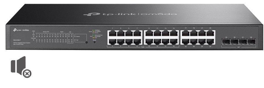 28-portový gigabitový PoE switch Omada TP-link SG2428LP s možností napájet až 16 IP zařízení současně díky portům PoE+ vyhovující standardu 802.3at/af do maximálního výkonu 150W s výkonem na jeden port maximálně 30W. IP zařízení lze napájet do 100 metrů od switche přes UTP Cat5E. Přepínací kapacita 56Gb/s. Síťové připojení je zajištěno pomocí portu 24x RJ45 (1Gbps) pro metalické rozvody, při využití 4x optických rozvodů s SFP moduly rovněž 1Gbps. Napájení je 230V AC se spotřebou do 184.7 W. Rozměry jsou 440×220×44 mm. Provozní teplota 0°C až do +40°C. Switch je integrován do platformy Omada SDN a lze jej spravovat přes aplikaci Omada.