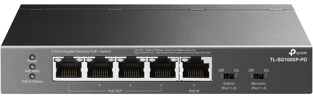 5 portový neřízený PoE switch TP-link TL-SG1005P-PD s 1 vstupním portem PoE++ a 4 výstupními porty PoE+ umožňuje napájet až 4 zařízení současně do maximálního výkonu 66W. IP zařízení lze napájet do 100 metrů od switche přes UTP kabel Cat 5/5E/6, při zapnutí extend modu až do 250m na portech 1-2. Síťové připojení je zajištěno pomocí portů 5x RJ45 10/100/1000 Mb/s pro metalické rozvody. Napájení zařízení přes PoE s max. spotřebou 68,59W. Rozměry jsou 158 × 101 × 25 mm. Provozní teplota -30°C až do +70°C.