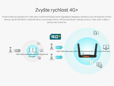 První 4G+ router od výrobce TP-link, Archer MR600 urychlí rychlost přenosu dat až na 300 Mb/s s kapacitou 64 bezdrátových připojení současně, jako jsou telefony nebo laptopy. Router taktéž disponuje 4 gigabitovými LAN porty. K dispozici jsou také pokročilé technologie MU-MIMO ke zvýšení propustnosti sítě a TP-Link OneMesh k vytvoření Mesh sítě pokrývající celé domácnosti. Správa a nastavení zařízení je možná přes aplikaci Tether.