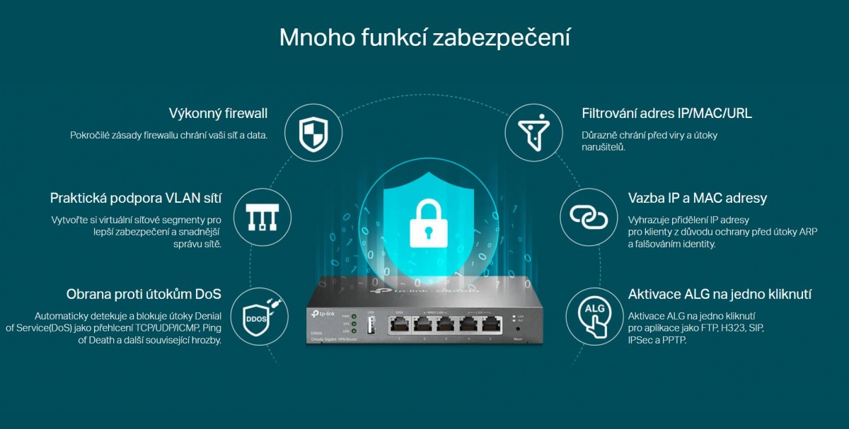 5-portový gigabitový router TP-link ER605 řady Omada poskytuje vysokorychlostní připojení, VPN s vysokým zabezpečením, funkci rozdělování zátěže mezi porty WAN a mnoho dalších chytrých funkcí. Správa zařízení je možná přes aplikaci Omada.