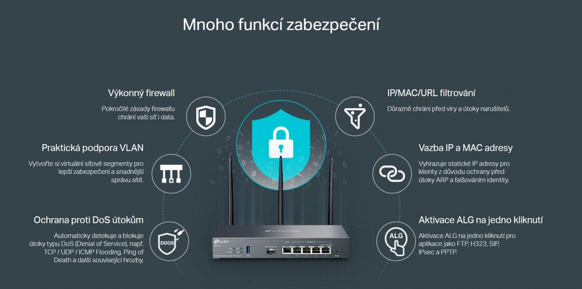 6-portový gigabitový router TP-link ER706W řady Omada nabízí dvoupásmovou WiFi s vysokým pokrytím o rychlosti 574 Mb/s na pásmu 2,4 GHz a 2 402 Mb/s na pásmu 5 GHz. Router disponuje VPN s vysokým zabezpečením, funkci rozdělování zátěže mezi porty WAN a mnoho dalších chytrých funkcí. Správa zařízení je možná přes aplikaci Omada.