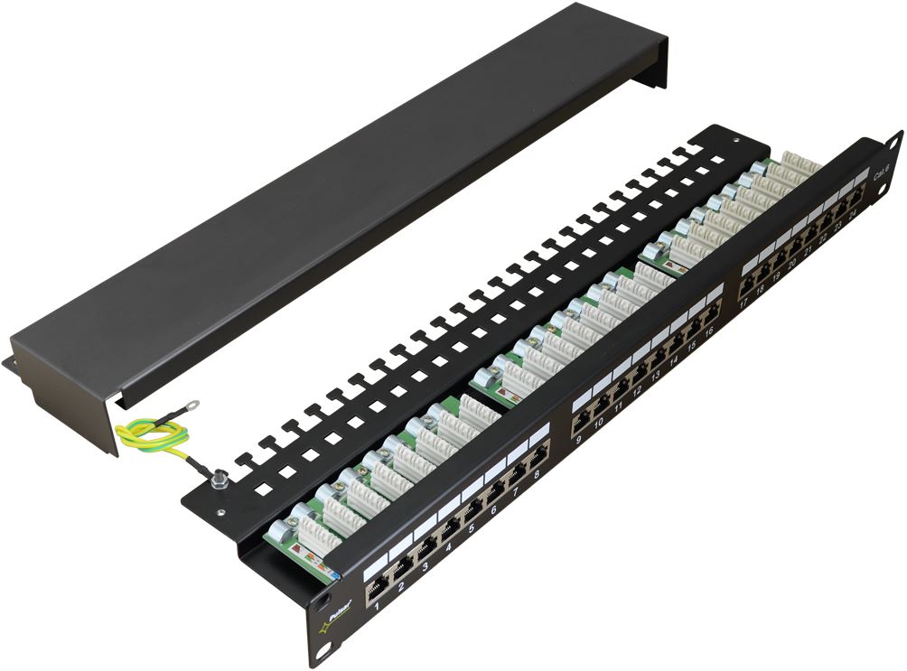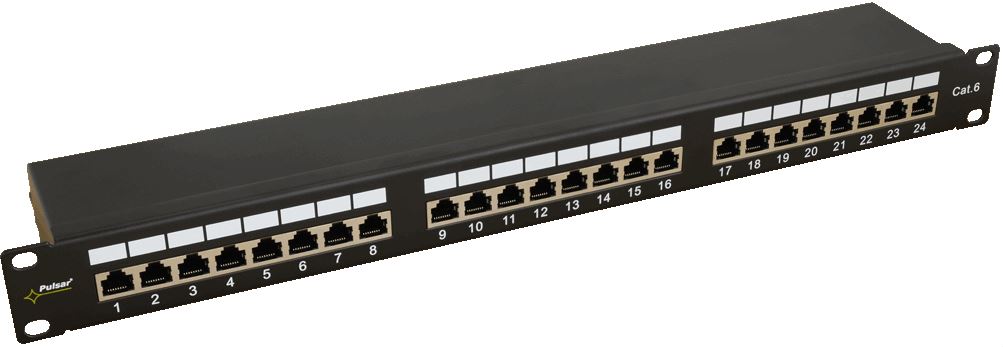 Patch panel 24 portů FTP CAT6 Pulsar RP-U24V6. 24x RJ45 CAT6 stíněný konektor. 24x LSA pásek - horizontální.