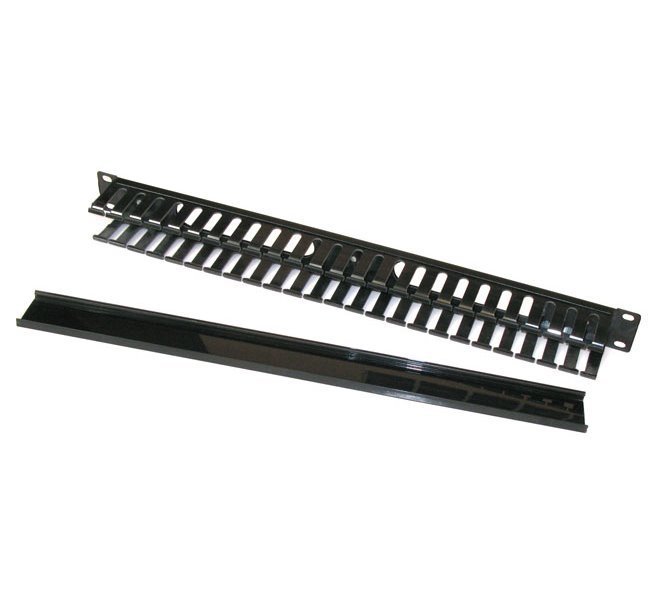 Vyvazovací panel s plastovým krytem vhodný pro uchycení velkého množství kabelů do 19" racku. Výška 1U, profil pro kabely 40x50mm. Barva: černá.