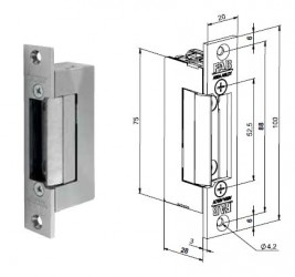 Nízkoodběrový elektrický otvírač FAB PROFI s mechanickým blokováním , napájení 12VDC, odběr 230mA, rozměry 75 x 28 x 20mm.