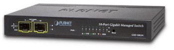10 portový řízený switch Planet Technology Corporation GSD-1002M s možností napájet až 8 IP zařízení současně. SFP (1Gbps), napájení je 48-56V DC se spotřebou do 11W.