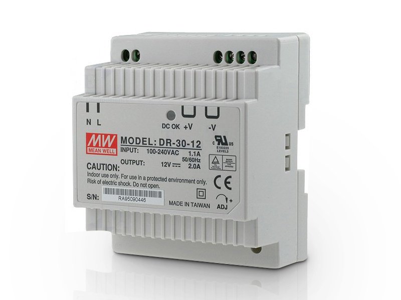 PRODEJ UKONČEN! Napájecí zdroje DR-30-12 na liště DIN disponují vstupním napětím 85÷264VAC / 120÷370VDC a výstupním napětím 2A/12VDC. Rozsah regulace napětí je 10,8V÷13,2V. Ochranu poskytuje OLP, OVP, SCP*. Rozměry zdroje jsou 78 x 93 x 56 mm.