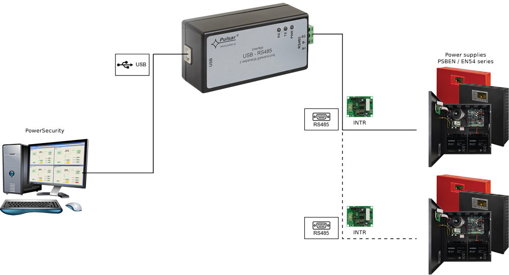 INTR - Interface RS485-TTL - Rozhraní RS485-TTL „INTR umožňuje připojení zdrojů série PSBEN (Black Power) / EN54 (Red Power) k galvanicky oddělené sběrnici RS485.