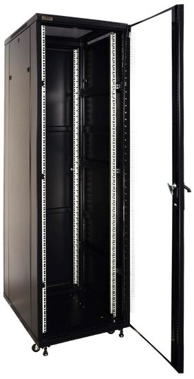 PRODEJ UKONČEN! Úložnou výšku : 42U Standard : 19" Způsob použití : na postavení (nožičky a kolečka v balení) Barva : černá - RAL 9004 Nosnost : 800kg Rozměry : 2055x600x800mm Dveře : přední = prosklené se zámkem - 5mm tvrzené sklo (2 klíče v balení) zadní = se zámkem (2 klíče v balení) Balení : nesmontováno